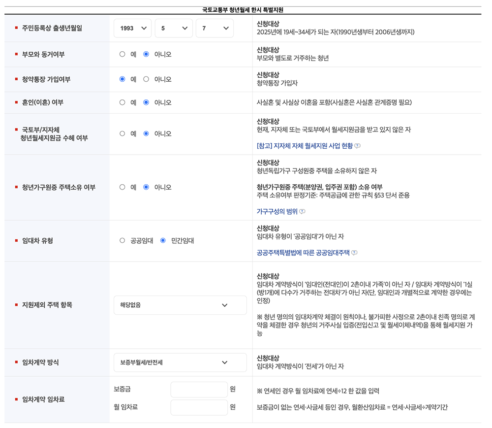 - 실제 거주 중인 주택의 보증금과 월세를 입력해야 합니다.