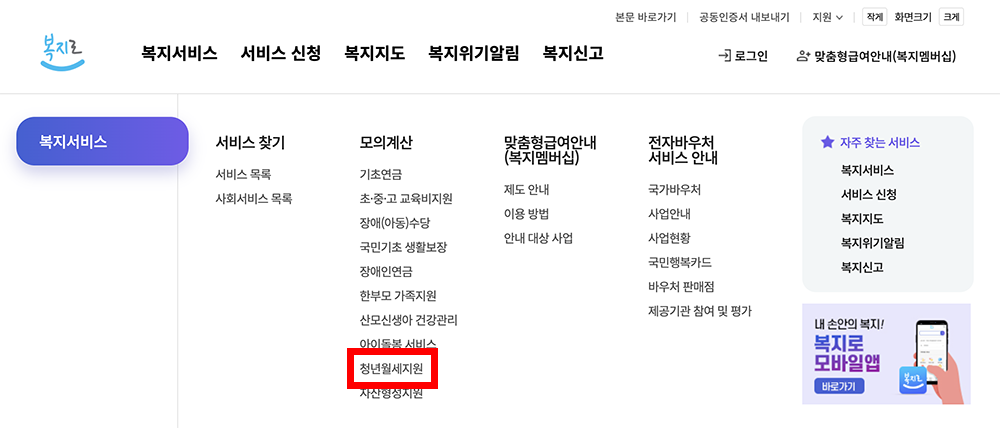 먼저, 인터넷 검색창에 ‘복지로’를 입력해 공식 사이트에 접속합니다. 상단 메뉴에는 여러 복지 서비스를 조회할 수 있는 항목이 보이는데, 여기서 ‘복지서비스 찾기 → 모의계산’ 메뉴를 클릭해야 합니다. 이곳에서 청년, 노인, 장애인 등 대상별로 지원 여부를 가늠해 볼 수 있는 다양한 계산기가 제공되며, 그중에서 ‘청년월세지원금’을 선택하면 됩니다.