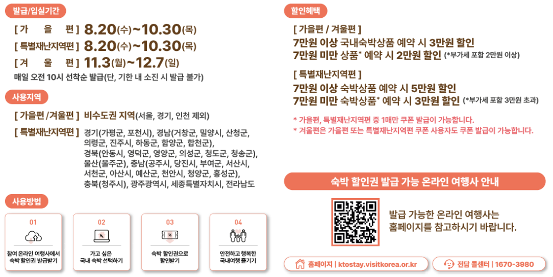 숙박세일페스타 할인쿠폰은 ‘가을 편’, ‘겨울 편’, ‘특별재난지역 편’으로 나뉩니다. 가을·겨울 편은 비수도권 숙박시설에만 적용되며, 7만 원 이상 숙박 시 3만 원, 7만 원 미만은 2만 원이 할인됩니다. 특별재난지역 편은 최대 5만 원까지, 7만 원 미만은 3만 원 할인을 제공합니다.