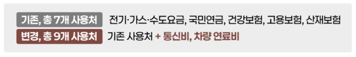 | 사용처 | 전기·가스·수도요금, 국민연금, 4대 보험, 통신비, 차량 연료비 |